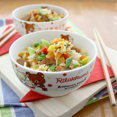 Add the sausage, rice and soy sauce and stir-fry until piping hot.