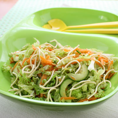 Halve your cucumber lengthwise, scoop the seeds out with a teaspoon and slice into half-moons. Place in a salad bowl. Mix in the cabbage, carrot, spring onion and noodles.