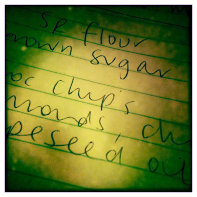 Yes, I know, there are apps to sort out this aspect of my life, but I’m old fashioned and find the act of writing lists surprisingly soothing. And generally the act of writing a word sticks it into my memory, which is handy, considering I’m now going to shop for a full week’s food without MY LIST.