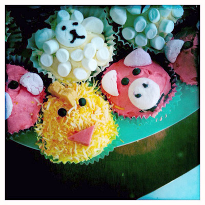 As regular readers will know, I love to try and keep party things pretty simple with small menus and a strict one-colour birthday cake policy. So you can image my horror when Miss F presented me with Annabel Karmel’s “My first cookbook” opened at farmyard cupcakes and an announcement that she’d happily forfeit a big cake in favour of these. Now I’m known to be generally undaunted by creative pursuits (being that I make a large proportion of my income as an illustrator) but even I was unprepared to take on the doggies, opting instead for these cute Betty Crocker chickens. They turned out well and the kids loved them.