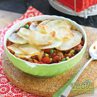 Reheat the pan and add the onions and celery, stirring often until softened (about 5 minutes). Add in the garlic for a minute until fragrant, then sprinkle over the flour. Cook it out, stirring constantly to avoid lumps. After a minute it will start to smell sweeter and you can slowly add in the warm stock, Worcestshire sauce and tomatoes. Stir well, season with pepper. Add the sumac and the bay leaf. Tip this into the slow cooker, then toss in the vegies (except the peas). Mix well.