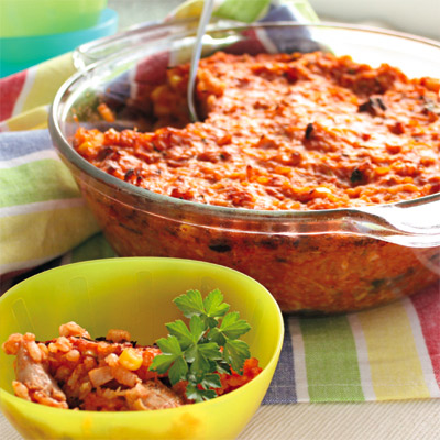 Rain in the rice, pour over the stock. Mix well. Pop on your lid, transfer to the oven and bake in the oven for 25 minutes.