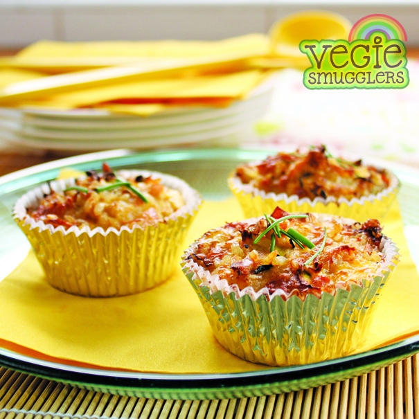 In a large bowl, lightly whisk the eggs. Add the remaining ingredients (including rice) and mix until combined. Divide evenly between the muffin cases and bake for 25 minutes until golden.